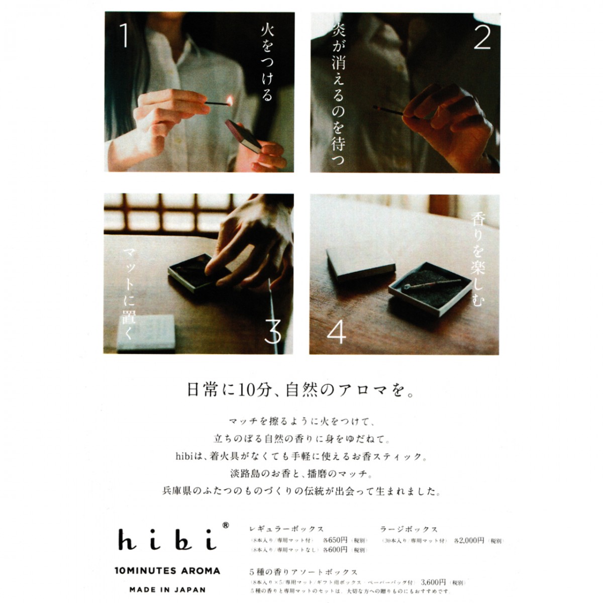 日常に10分、自然のアロマを。 マッチを擦るように火をつけて、 立ちのぼる自然の香りに身をゆだねて。 hibiは、着火具がなくても手軽に使えるお香スティック。 淡路島のお香と、播磨のマッチ。 兵庫県のふたつのものづくりの伝統が出会って生まれました。 001 レモングラス:レモンのような甘酸っぱさと、緑の草原を思わせるすがすがしさ。疲れを癒してリフレッシュしたい時に。 002 ラベンダー:気品のあるフローラルな香り。心を落ち着かせてリラックスしたい時や、眠りの前のひとときに。 003 ゼラニウム:バラに似たほのかな甘さとグリーンノートが混じりあう香り。不安定な心のバランスを取り戻したい時に。 004 イランイラン:濃厚で官能的な甘さのあるややエキゾチックな香り。緊張をほぐして深く満たされた気分になりたい時に。 005 ティーツリー:清涼感のあるスパイシーな香り。イライラや沈んだ心を鎮めて、気持ちをすっきりさせたい時に。